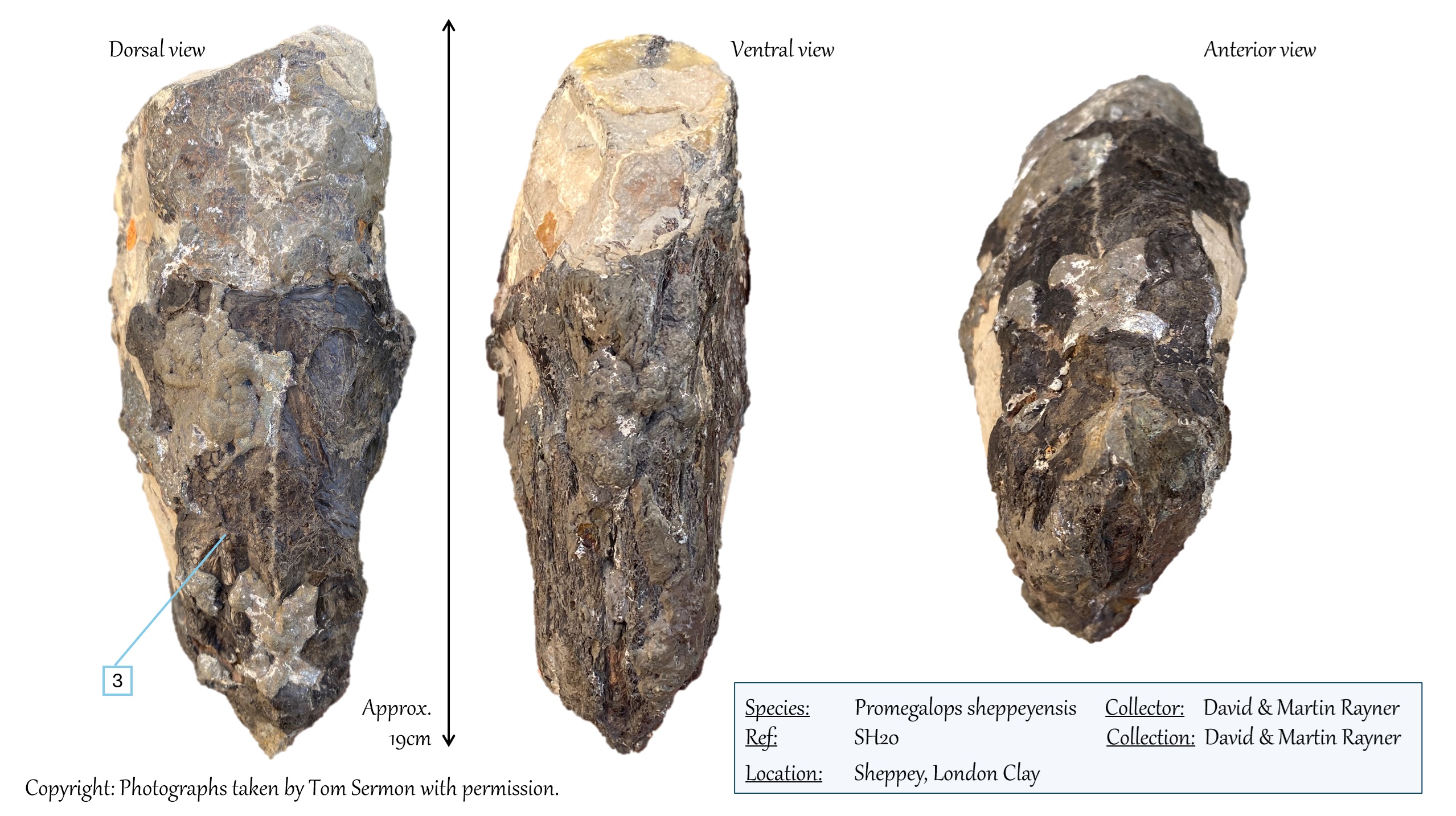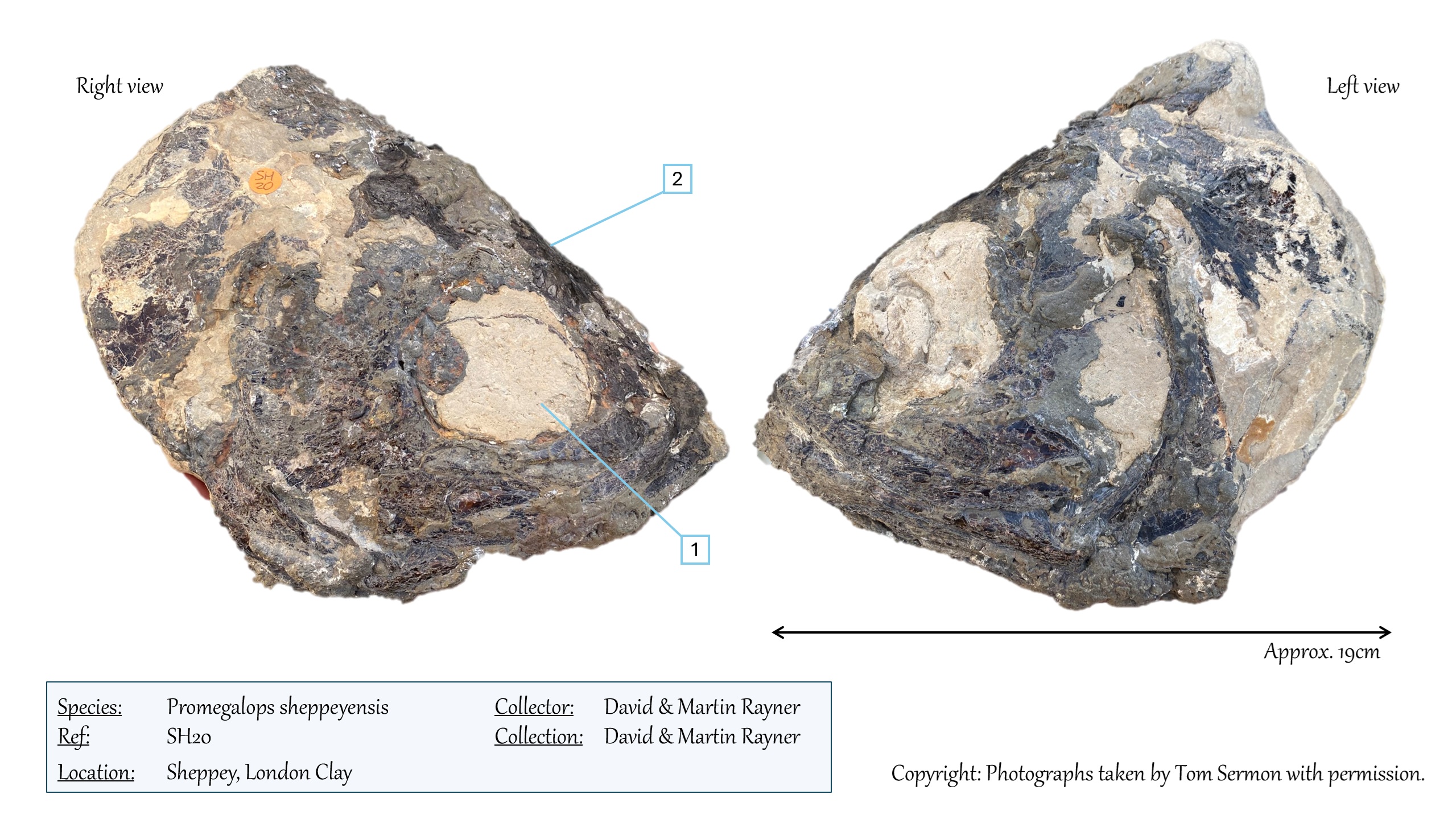 This is an incredibly rare London Clay fish with one confirmed specimen in the collection of the Natural History Museum, London and a more complete specimen which is also believed to represent P.sheppeyensis. The Holotype for this specimen is only a neurocranium so provides some limitations when comparing it to more complete specimens which is why it is somewhat difficult to say conclusively that the second, more complete specimen, represents the same species. The second specimen is certainly Promegalops genus however.