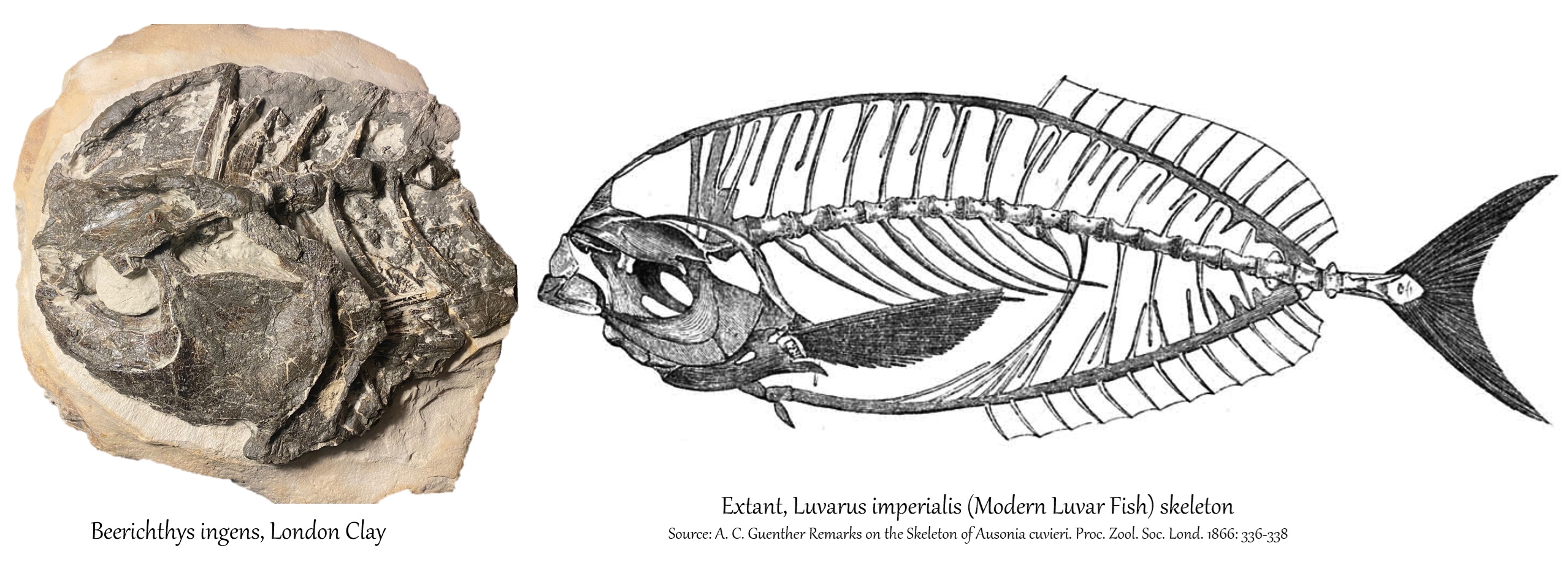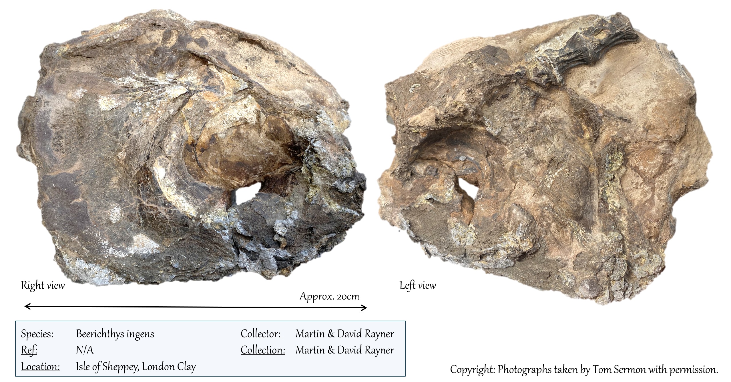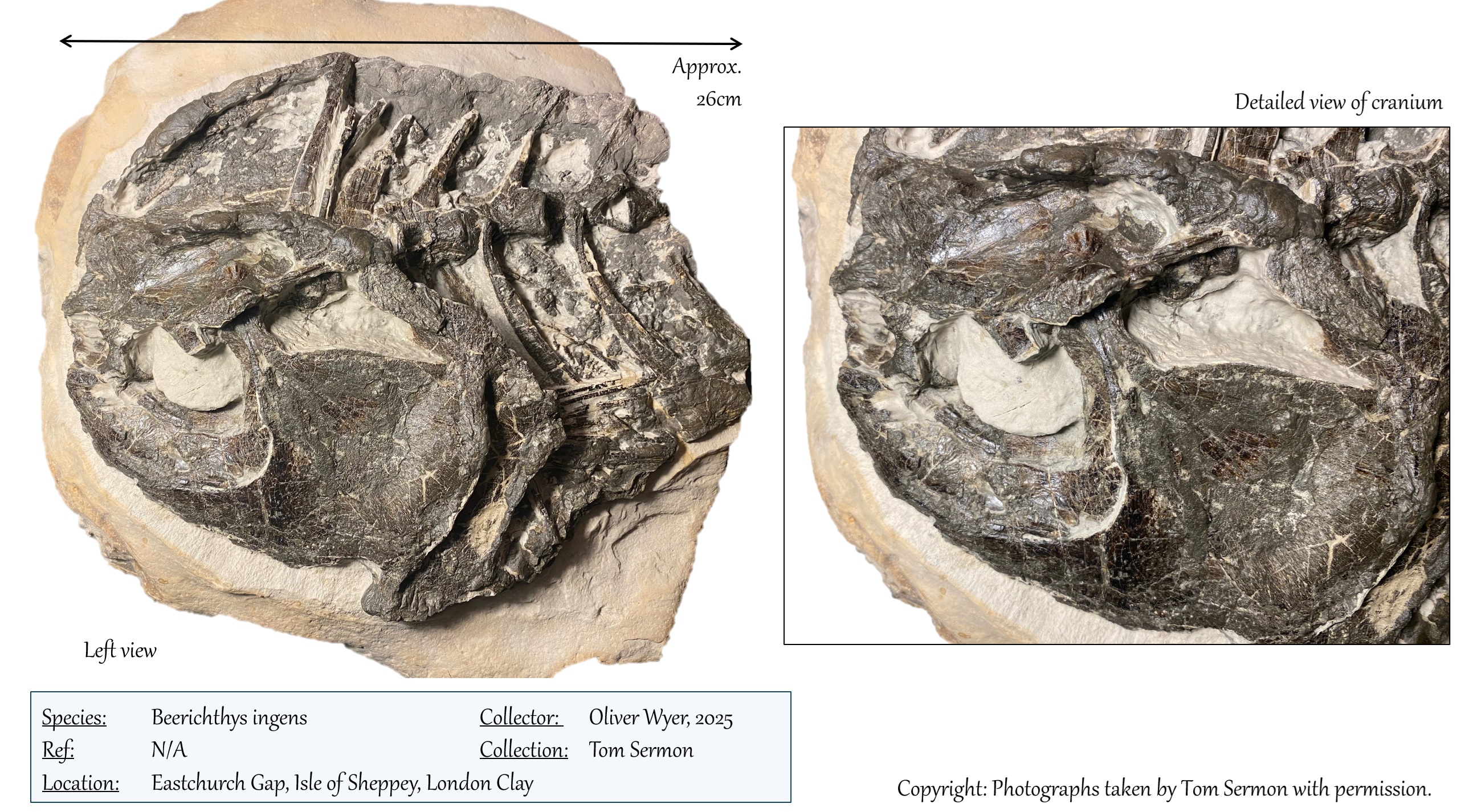 Beerichthys ingens is a very unusual fish from the London Clay which up until recently was only known from a small number of partially preserved skulls. Earlier in 2025 however this changed with the discovery of a new specimen showing near perfect articulation of both the skull as well as post-cranial anatomy. The discovery of this specimen was an excellent team effort having first been spotted on the beach by Dan Hogburn, subsequently collected by Oliver Wyer, prepped by myself (Tom Sermon) and then identified by Prof Matt Friedman. This latest specimen reinforces the thesis that Beerichthys was an early member of the Acanthuriformes and represents an early ancestor to modern Luvar fish (Luvarus imperialis) which is only represented by one living species. This specimen would benefit from some further research given it’s excellent preservation.