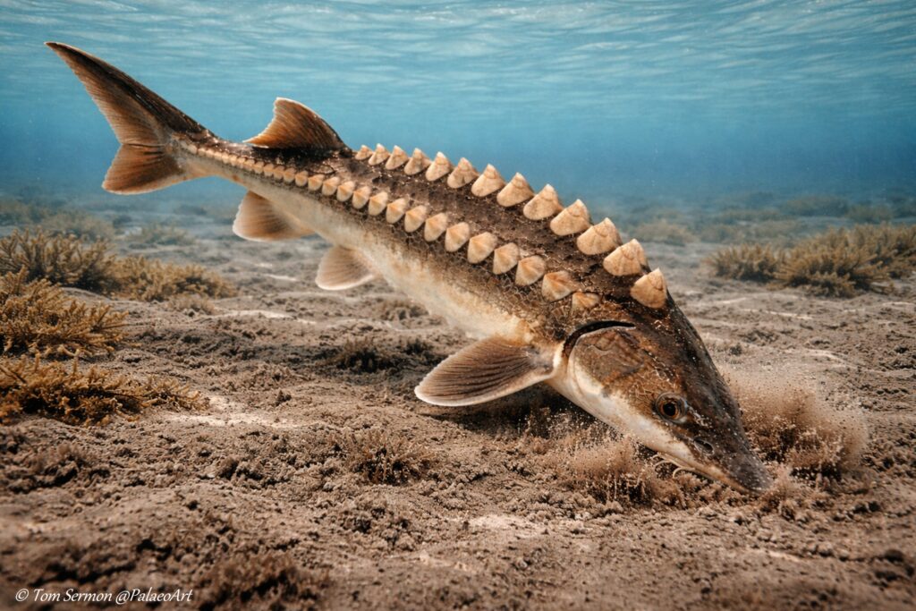 Here is an artistic reconstruction of Acipenser toliapicus in the sub-tropical Eocene seas hunting for worms & molluscs.