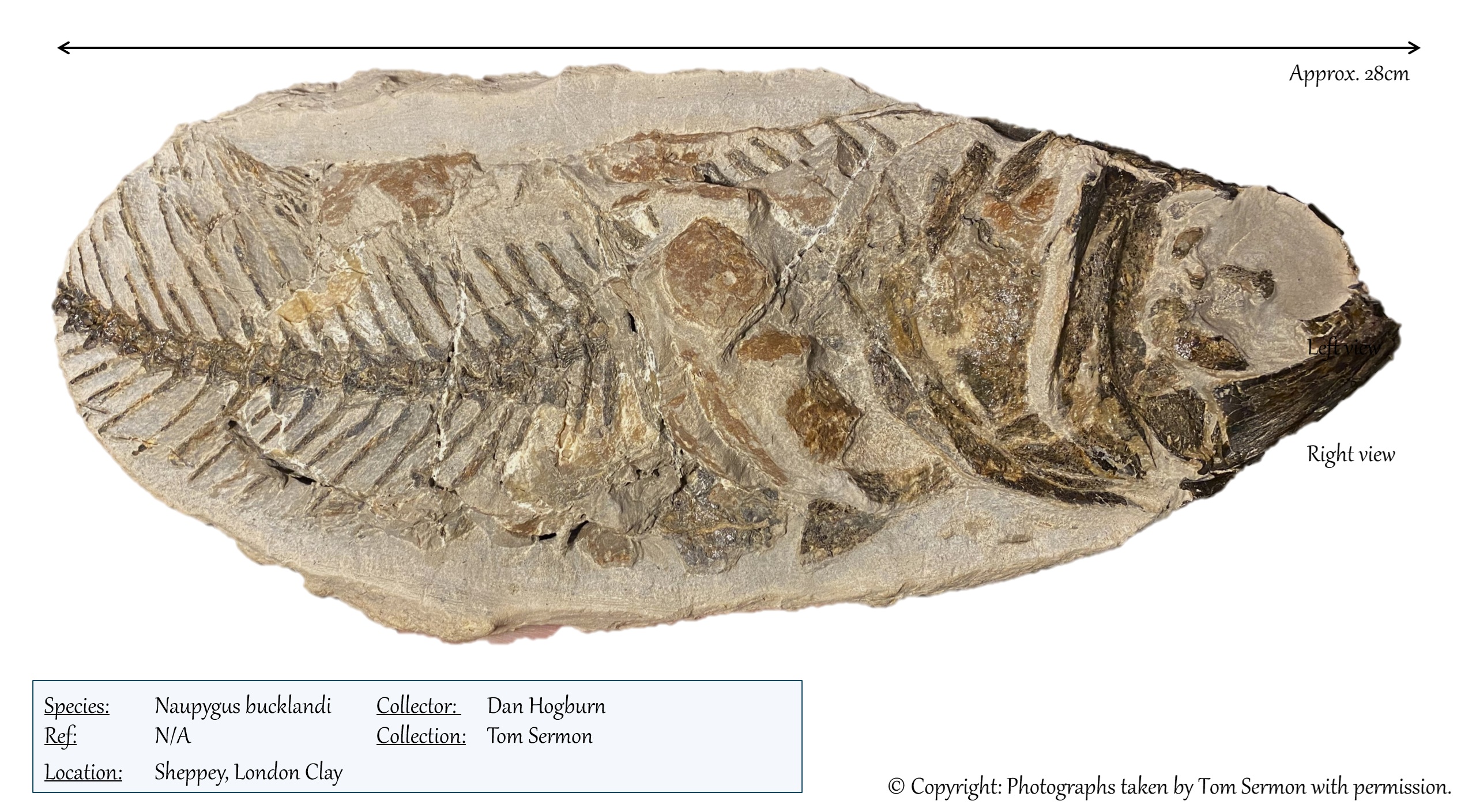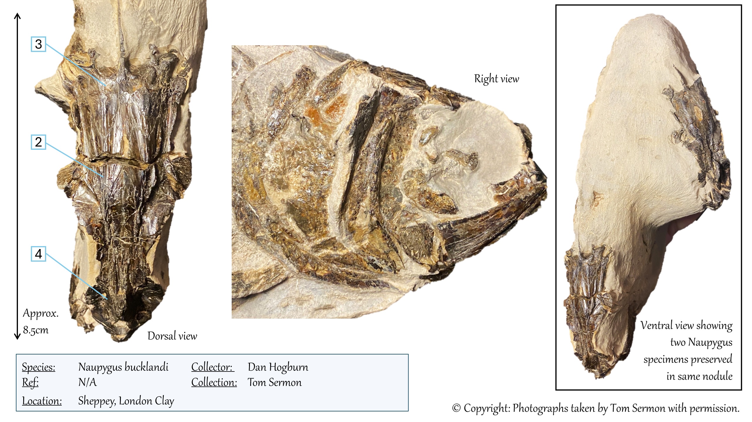 Naupygus bucklandi is a very rare fish from the London Clay with only a few specimens known. The best example is on display in the Oxford University Museum and showcases exceptional skull preservation. More recently, another specimen was found by local collector Dan Hogburn which not only contained fully articulated post-cranial anatomy of a Naupygus, but in fact contained two in the same species in the same septarian nodule.