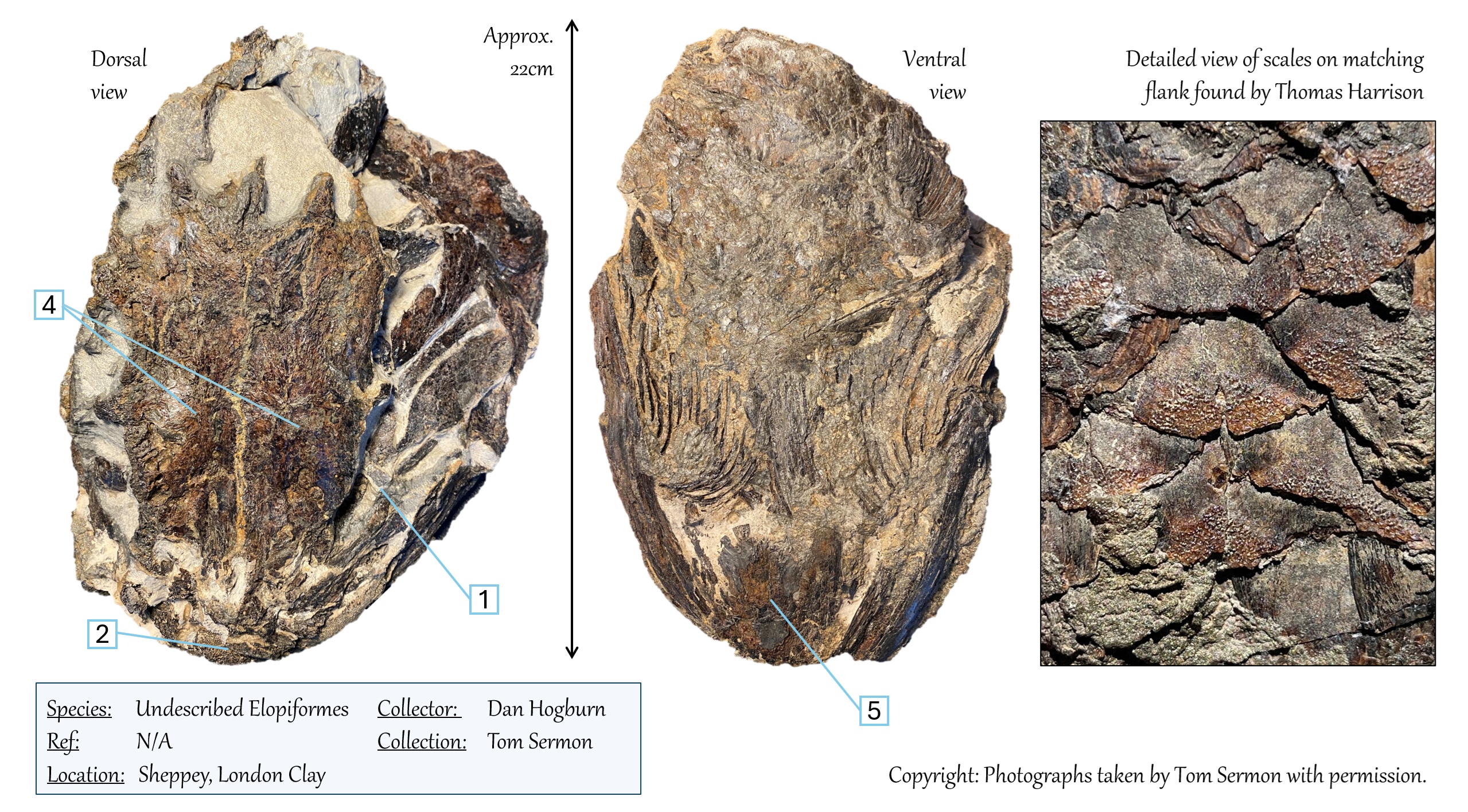 This is a large and well preserved London Clay fish skull found by Dan Hogburn in 2024 in the Division D/E of the London Clay of the Isle of Sheppey. A second, associated section of this specimen (a section of body with scales) was then found separately by Thomas Harrison. What at first glance looks fairly ‘catfish-like’ now appears, with the help of Prof Matt Friedman, to be an example of a Elopiformes fish – potentially a Promegalops species. The characteristics that helped with this identification is the presence of the gular bone on the underside of the skull (a feature only present in a few primitive fish families), the small teeth within the jaws and the shape & style of the large scales. More research is required to discover whether this represents an example of a known species (such as Promegalop signeuxae) or whether this might be a new member of this family.