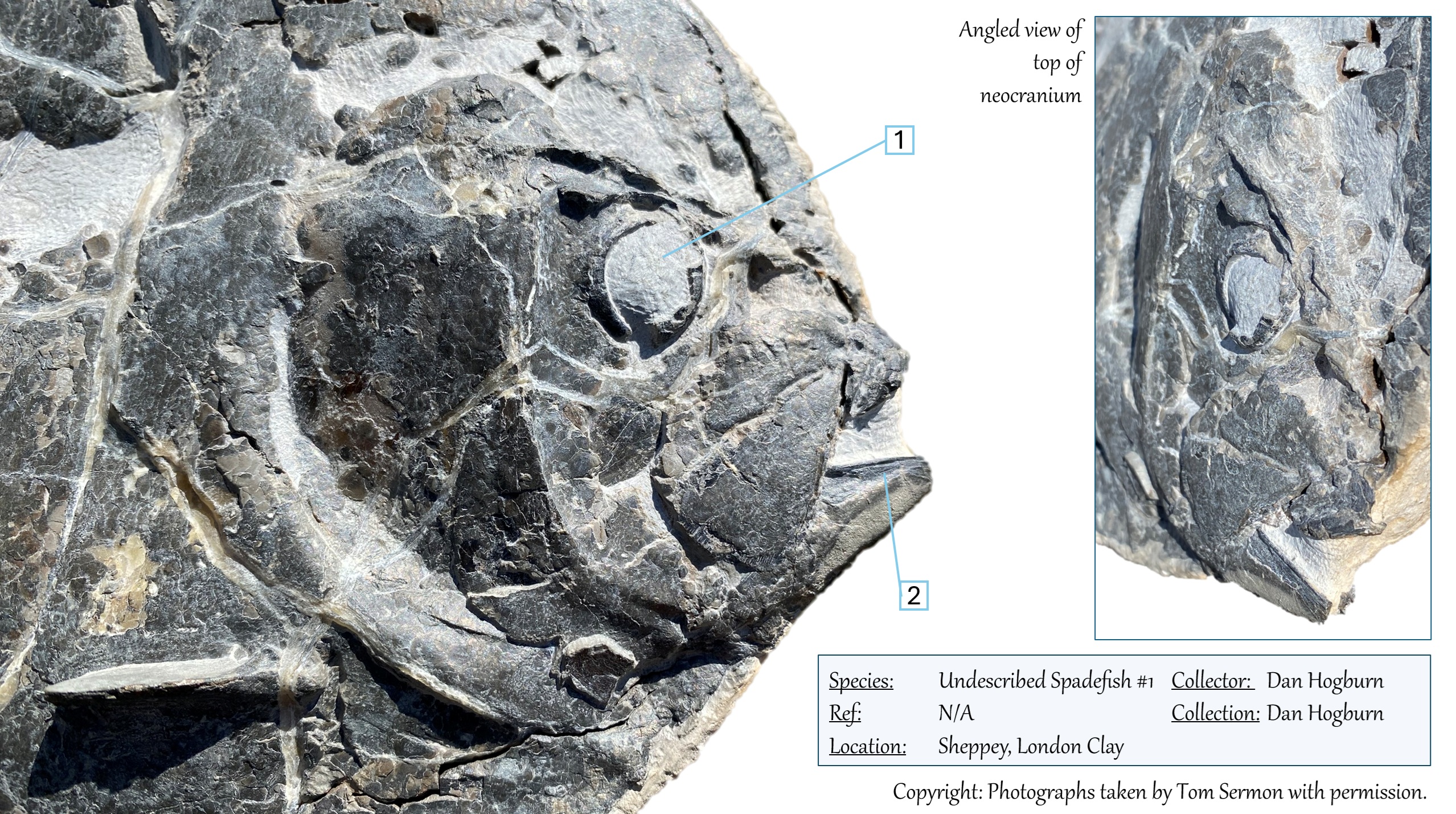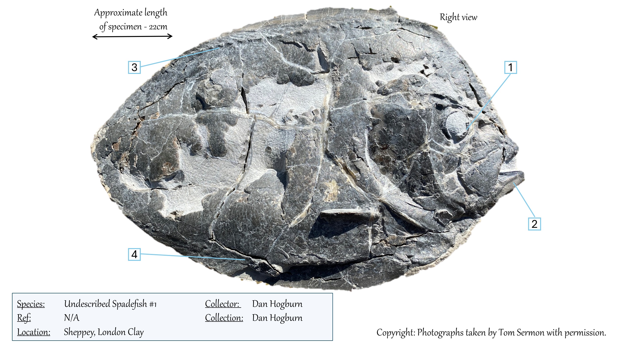 This is an absolutely exceptional fossil fish specimen which we now believe, through the help of Prof Matt Friedman, represents an early member of the Spadefish family (Ephippidae). This was found by Dan Hogburn (and expertly prepped by Tony Vale) in Division D/E of the London Clay on the Isle of Sheppey. This specimen would benefit from further research given the exceptional details preserved.