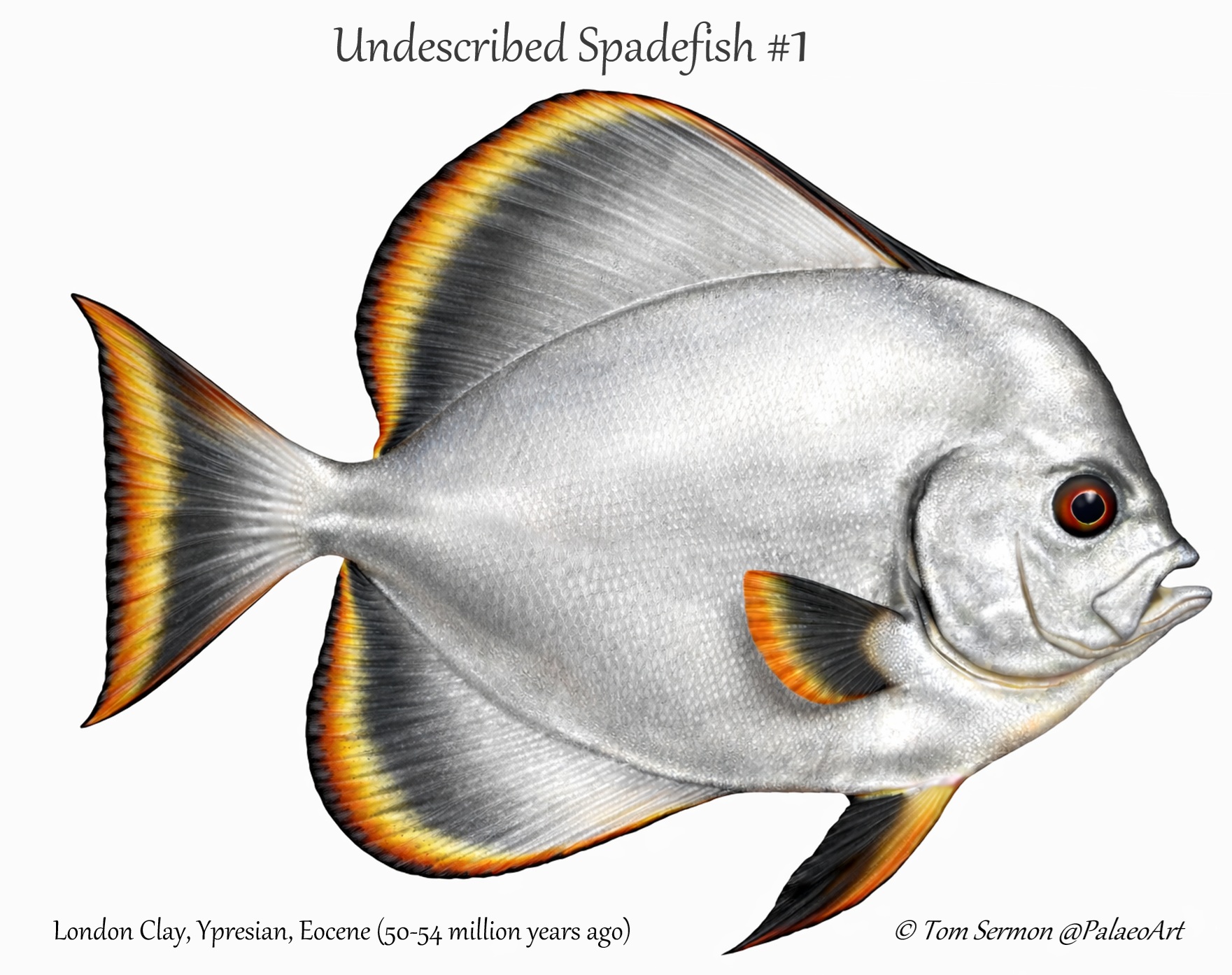 This is an absolutely exceptional fossil fish specimen which we now believe, through the help of Prof Matt Friedman, represents an early member of the Spadefish family (Ephippidae). This was found by Dan Hogburn (and expertly prepped by Tony Vale) in Division D/E of the London Clay on the Isle of Sheppey. This specimen would benefit from further research given the exceptional details preserved.
