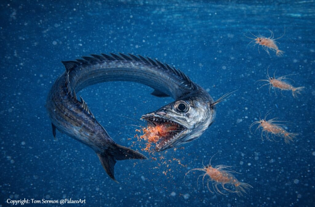 This artistic reconstruction shows a Progempylus edwardsi fish feeding on the pelagic larvae stage of London clay lobster.