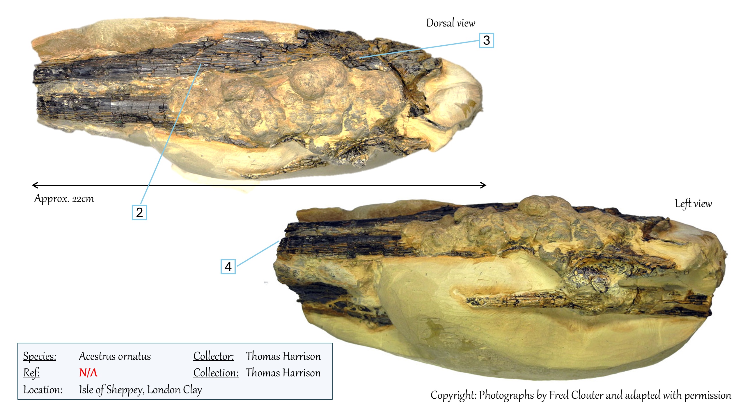 Acestrus ornatus is only know from a few specimens and sadly all of these are only partials however a combination of all of these helps give a clearer impression of this small billfish. Acestrus ornatus is characterised by heavy ornamentation (including deep grooves and striations) on the top of the skull and a flattened elongated rostrum.