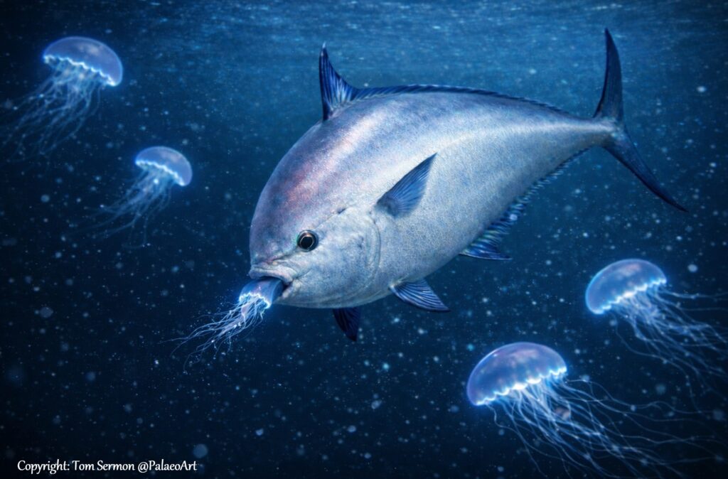 Part of the Acanthuriformes order (which are a diverse group containing many tropical reef fish families including Snappers and Butterflyfish), Luvaridae is the only pelagic (open-ocean swimmer) representative within this order. Louvar fish are known for eating soft-bodied organisms (like Jellyfish). This is an artistic reconstruction of Beerichthys ingens feeding at night on soft jellyfish.