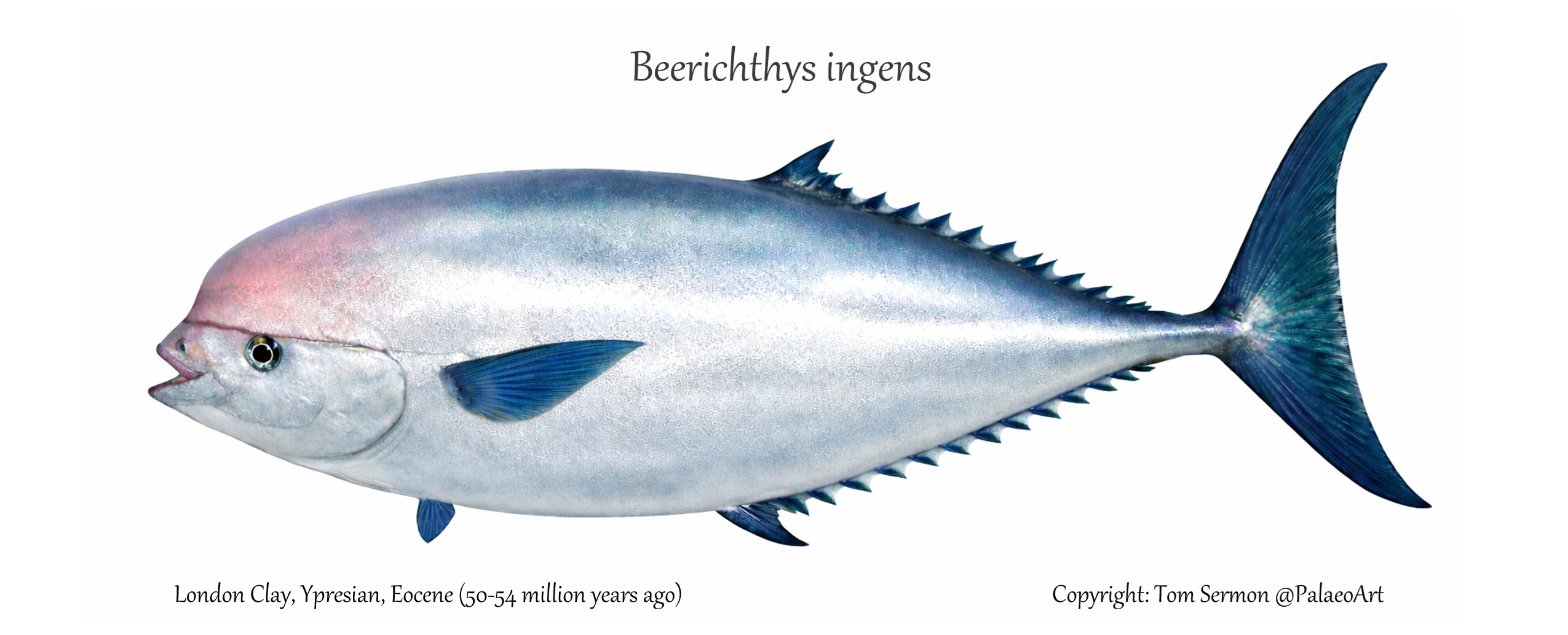 Beerichthys ingens is a very unusual fish from the London Clay which up until recently was only known from a small number of partially preserved skulls. Earlier in 2025 however this changed with the discovery of a new specimen showing near perfect articulation of both the skull as well as post-cranial anatomy. The discovery of this specimen was an excellent team effort having first been spotted on the beach by Dan Hogburn, subsequently collected by Oliver Wyer, prepped by myself (Tom Sermon) and then identified by Prof Matt Friedman. This latest specimen reinforces the thesis that Beerichthys was an early member of the Acanthuriformes and represents an early ancestor to modern Luvar fish (Luvarus imperialis) which is only represented by one living species. This specimen would benefit from some further research given it’s excellent preservation.