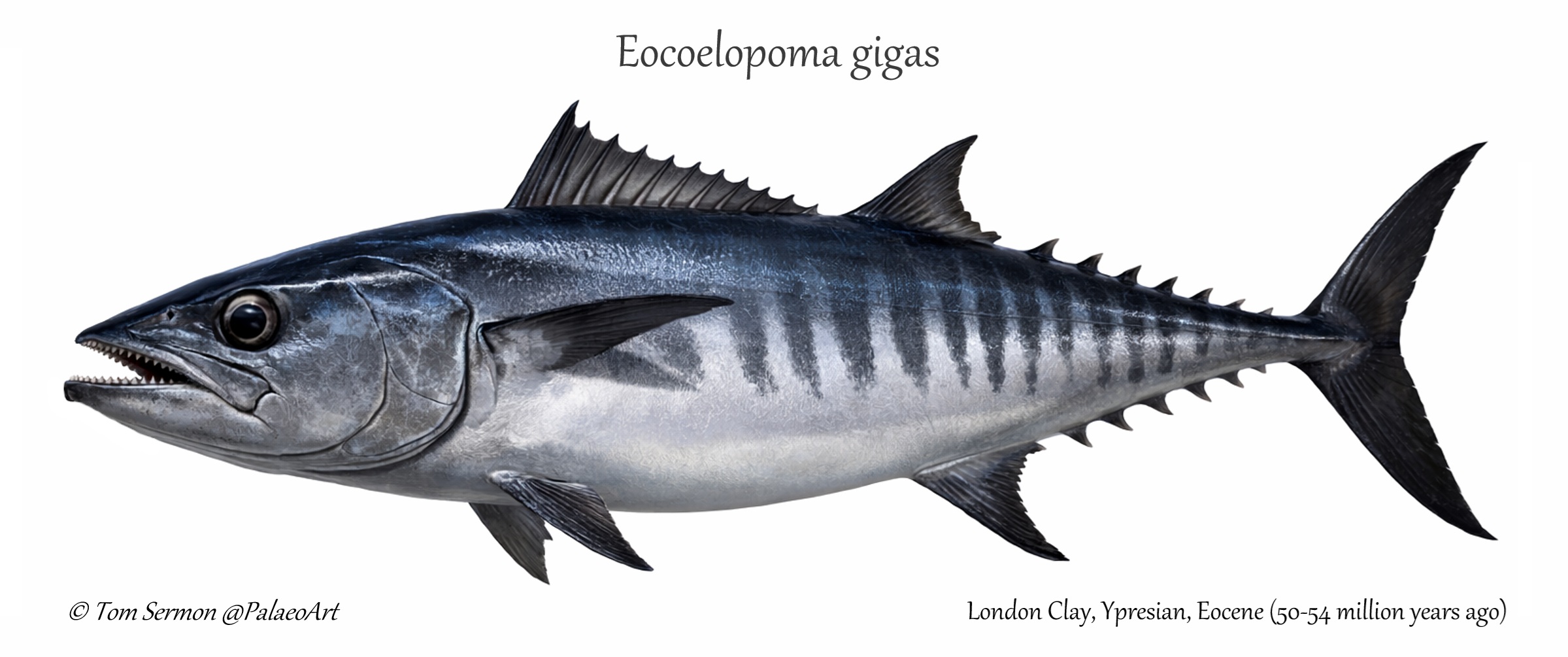 Eocoelopoma belongs to the Scombridae family of fish which include Tuna, Mackerel and Bonitos. This group is characterised for it’s streamlined body forms, and retractable fins, making them capable of generating incredible speed through the water – essential for their open-ocean predatory living.