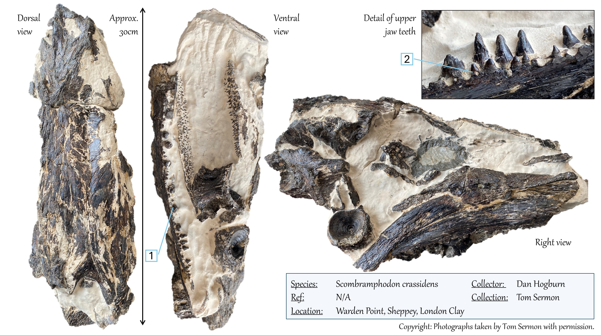 Scombramphodon crassidens is a rare fish from the London Clay and specimens that have been found are generally large. The skulls are robust and have two rows of teeth on both upper and lower jaws – consisting of a outside row of secondary smaller teeth, followed by a row of much larger, wide-base, heavily-striated teeth.